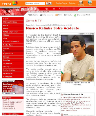 Ontem tivemos uma notícia circulando por vários blogs de que o (músico?) Rafinha tinha sofrido um acidente e que o estado dele era grave(esse é o Rafinha que ganhou 1 milhão no Big Brother).